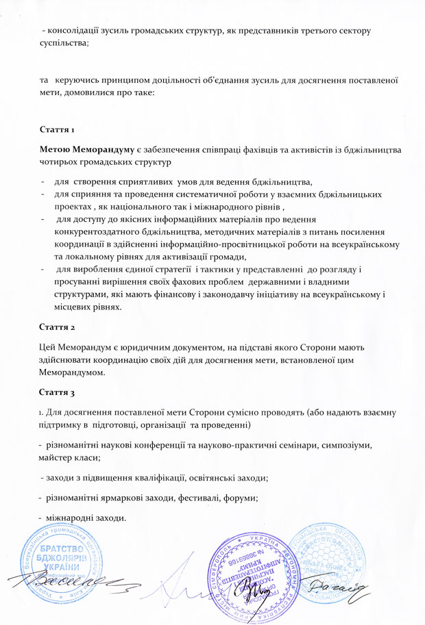 У Меморандумі викладені цілі і завдання щодо співпраці бджільницьких громад, намічені шляхи реалізації спільних програм, які націлені на розвиток бджільницьких громадських структур і бджільництва АР Крим і України в цілому.